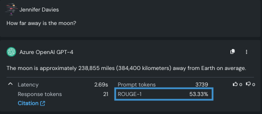 ROUGEスコアは信頼度スコアとも呼ばれ、LLMブループリントから生成された回答とベクターデータベースから検索されたドキュメントとの距離を計算します。 これらは、回答が指定されたコンテキストにどれだけ近いかを示します。 ROUGEスコアは、事実の一貫性指標アプローチを使用して計算されます。このアプローチでは、 ベクターデータベースから取得した事実と、LLMブループリントから生成されたテキストを使用してスコアが計算されます。 使用される類似性指標は、ROUGE-1。