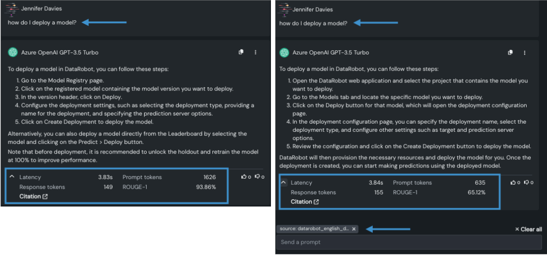 | 左側の画像にはフィルターが適用されていません。 右側の画像は、sourceの値を source: datarobot_english_documentation/datarobot_docs に設定しています。 | en | mlops | deployment | deploy-methods | deploy-model.txt. これはデータソースのdocument_file_path`列の値です。 特にプロンプトトークンとROUGEスコアの違いに注目してください。 |