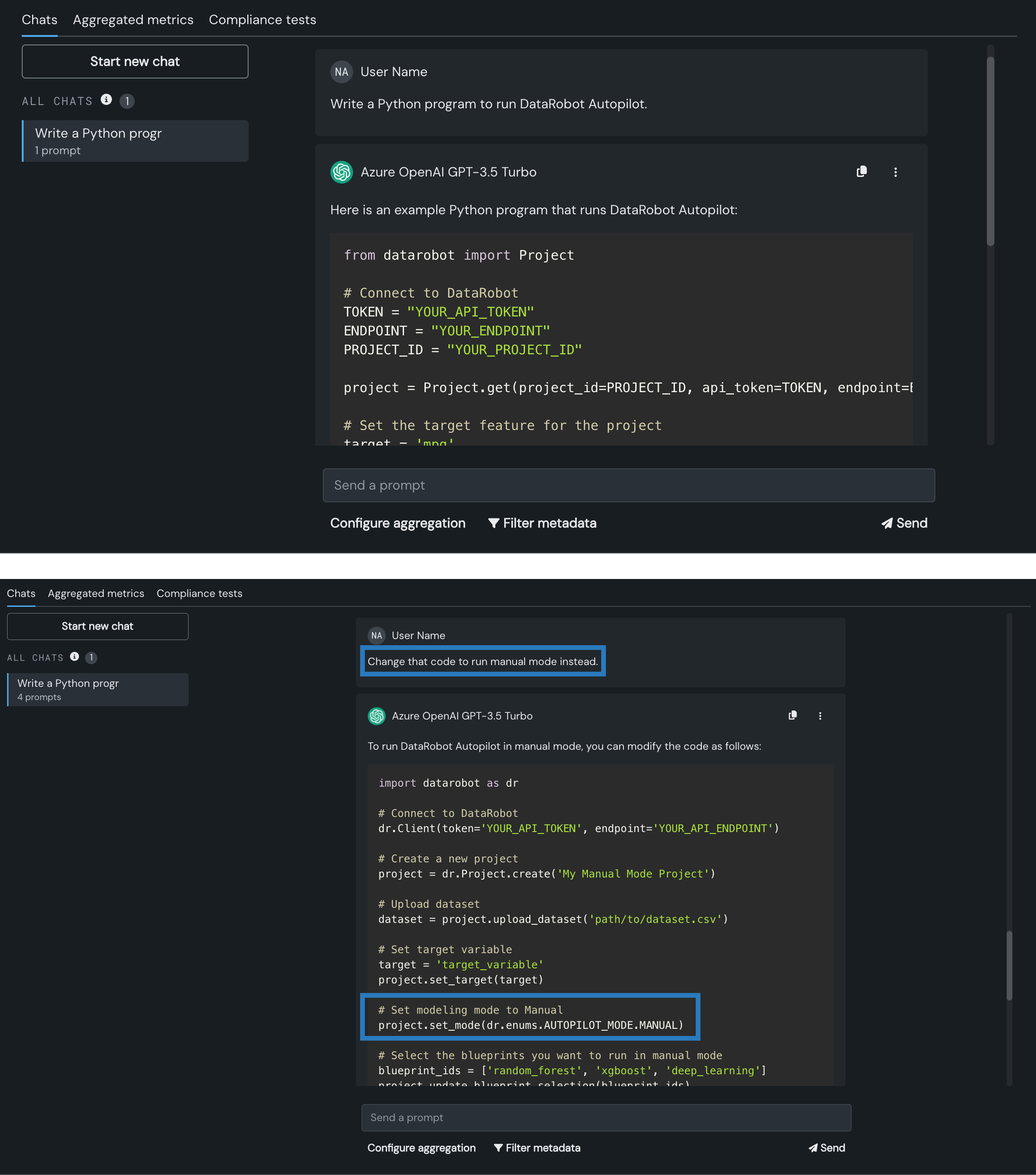 プレイグラウンド内でのチャットは「会話」で、それに続くプロンプトでフォローアップの質問をすることができます。 以下は、DataRobotオートパイロットを実行するためのPythonコードの出力をLLMに求める例です。