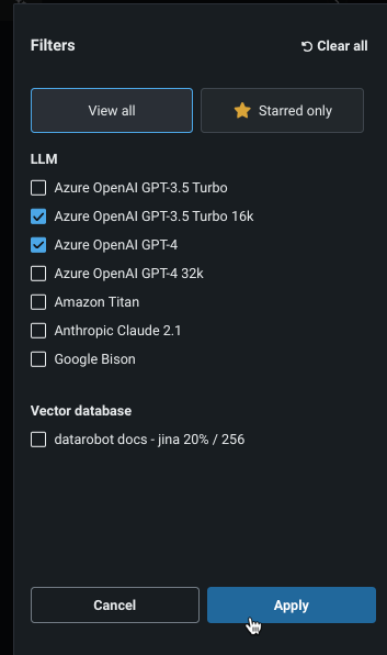 LLMブループリントタブには、プレイグラウンド内の設定済みのすべてのLLMブループリントが一覧表示されます。 このパネルから、LLMブループリント(最大3つ)を選択して比較します。 チェックボックスでLLMブループリントを選択すると、中央の比較パネルで使用できるようになります。 LLMブループリント名の横にある星 をクリックして「お気に入り」に追加すると、後でフィルターすることができます。
