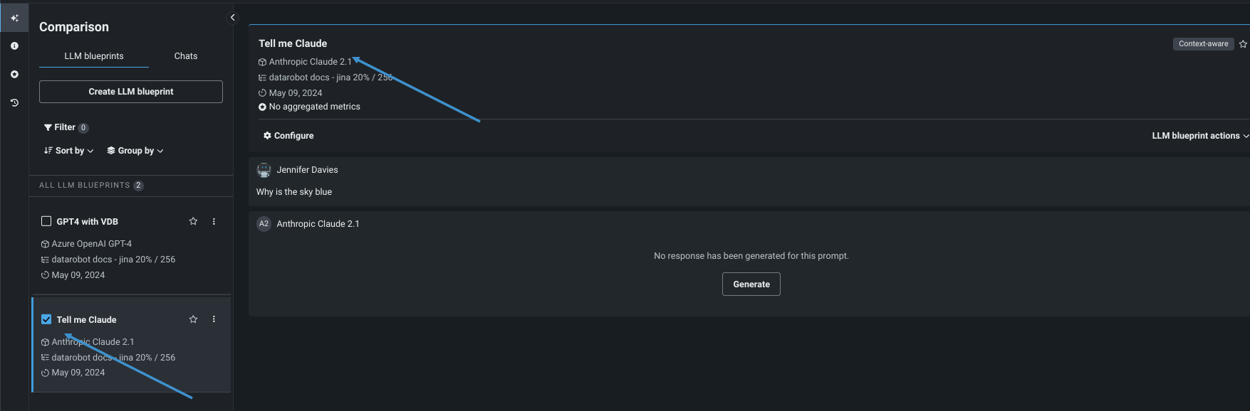 比較タブは、比較履歴を取得します。 新しいLLMブループリントのレスポンスは返されていないため、DataRobotには、そのアクションを開始するボタンがあります。 生成をクリックして、新しい結果を含めます。