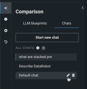 比較チャットは、多くの場合、複数のブループリントにわたって、1つ以上の比較プロンプトをグループ化します。 チャットタブを使用して、プレイグラウンドから行われた以前の 比較 プロンプトにアクセスするか、新しいチャットを開始します。 このようにして、最大3つのLLMブループリントを選択してクエリーを実行し、他のLLMブループリントに切り替え、同じプロンプトを送信して結果を比較できます。