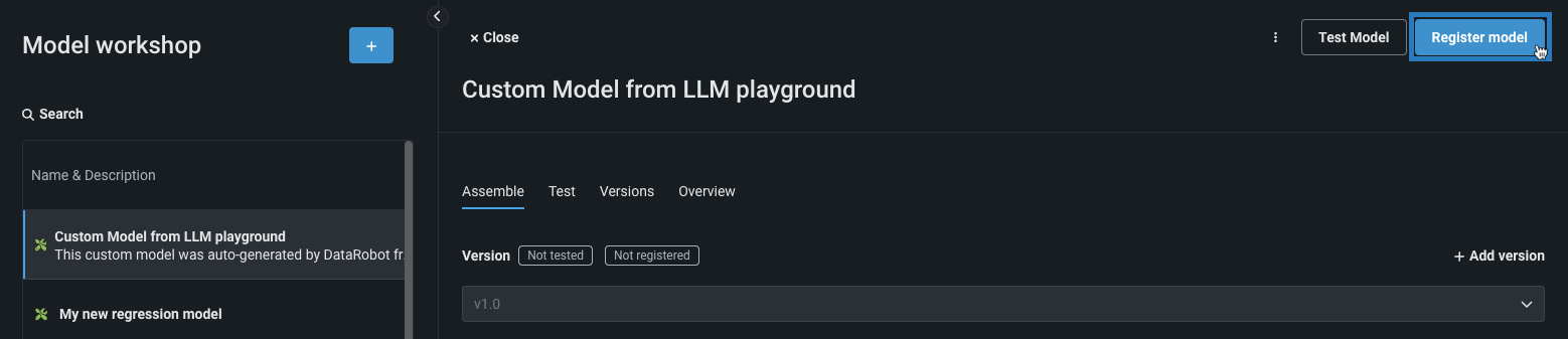 カスタムモデルの構築が完了したら、モデルをテストしたり、新しいバージョンを作成したりすることができます。 DataRobotでは、デプロイの前にカスタムLLMをテストすることをお勧めします。