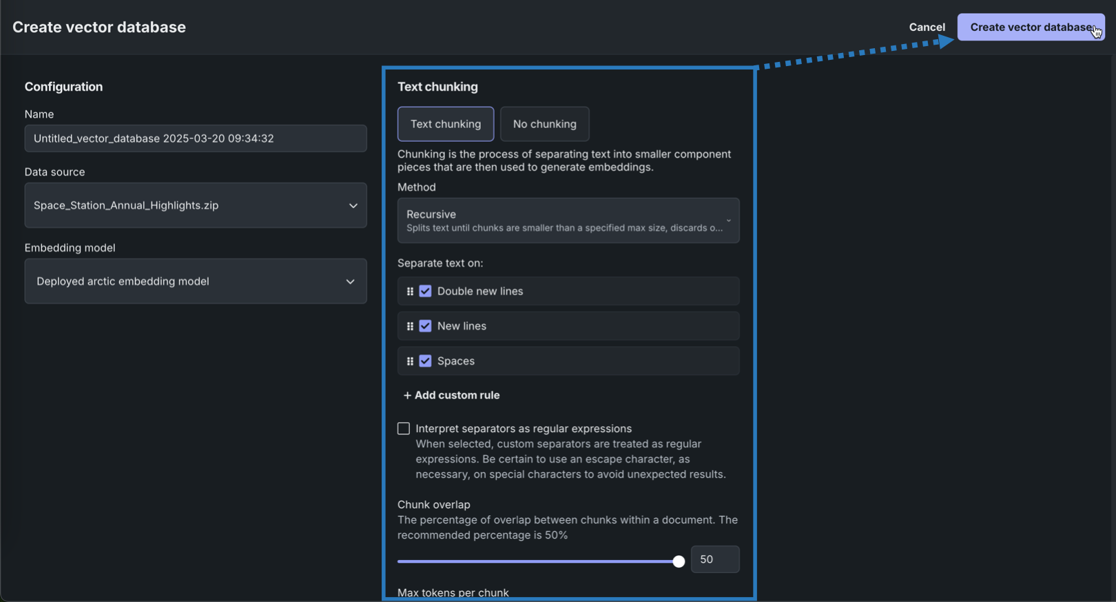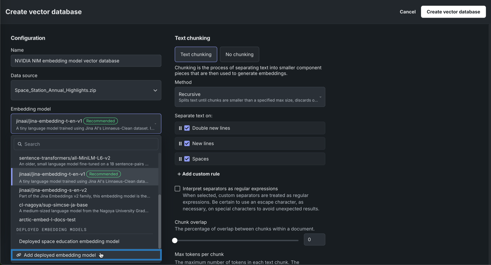 埋め込みモデルドロップダウンで、登録した埋め込みNIMをクリックします。 次に、ベクターデータベースのテキストチャンキング設定を行い、ベクターデータベースを作成をクリックします。
