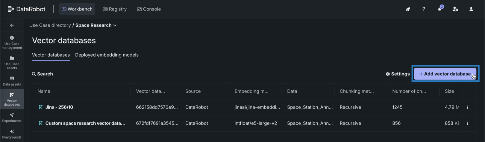 埋め込みNIMを登録したら、それをベクターデータベースに追加することができます。 DataRobotでは、デプロイプロセスが自動的に処理されます。