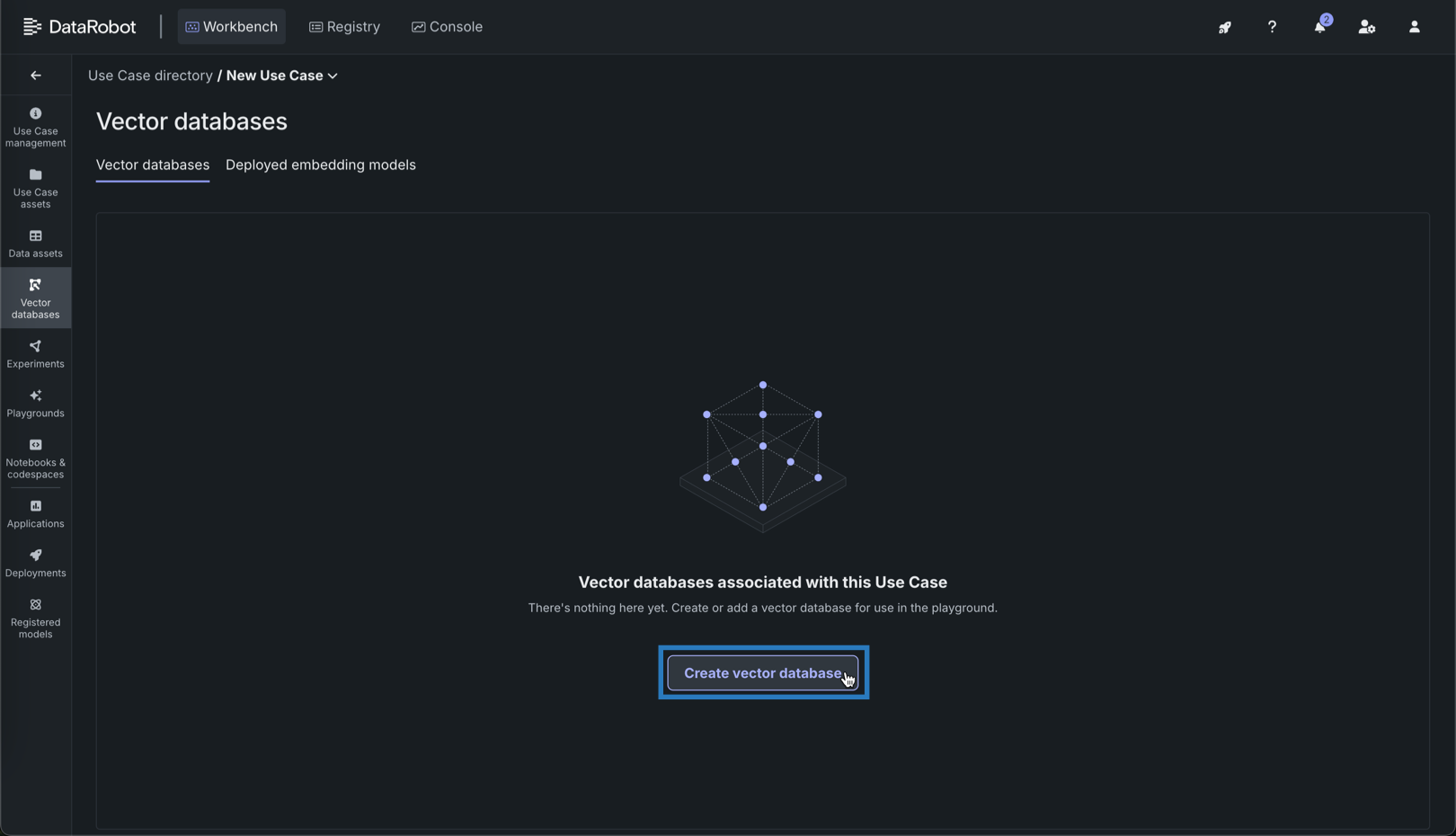ユースケースにベクターデータベースを追加したことがない場合は、ページ中央のベクターデータベースを作成をクリックします。