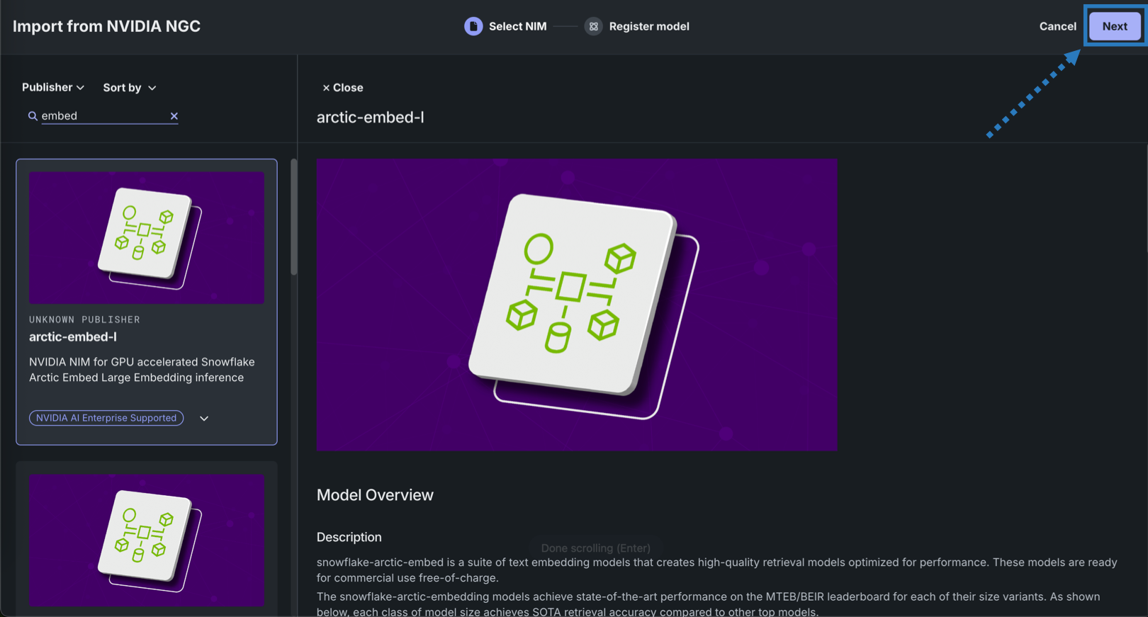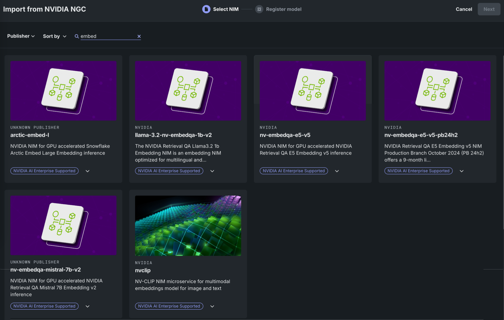 NVIDIA NGCからインポートパネルのNIMを選択タブで、ギャラリー内の埋め込みNIMをクリックします。