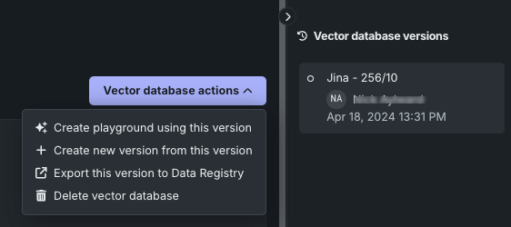 ベクターデータベースの詳細画面で、セレクターを使用して親から新しいバージョンを作成するか、またはベクターデータベースのアクションドロップダウンを使用して選択したバージョンから作成します。