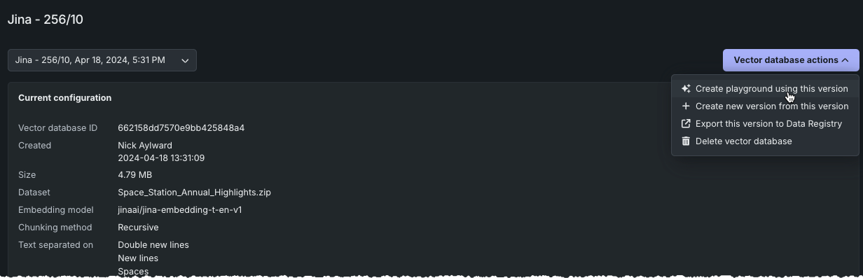 選択したバージョンのベクターデータベースからプレイグラウンドを作成するには、ベクターデータベースのアクションドロップダウンを使用します。