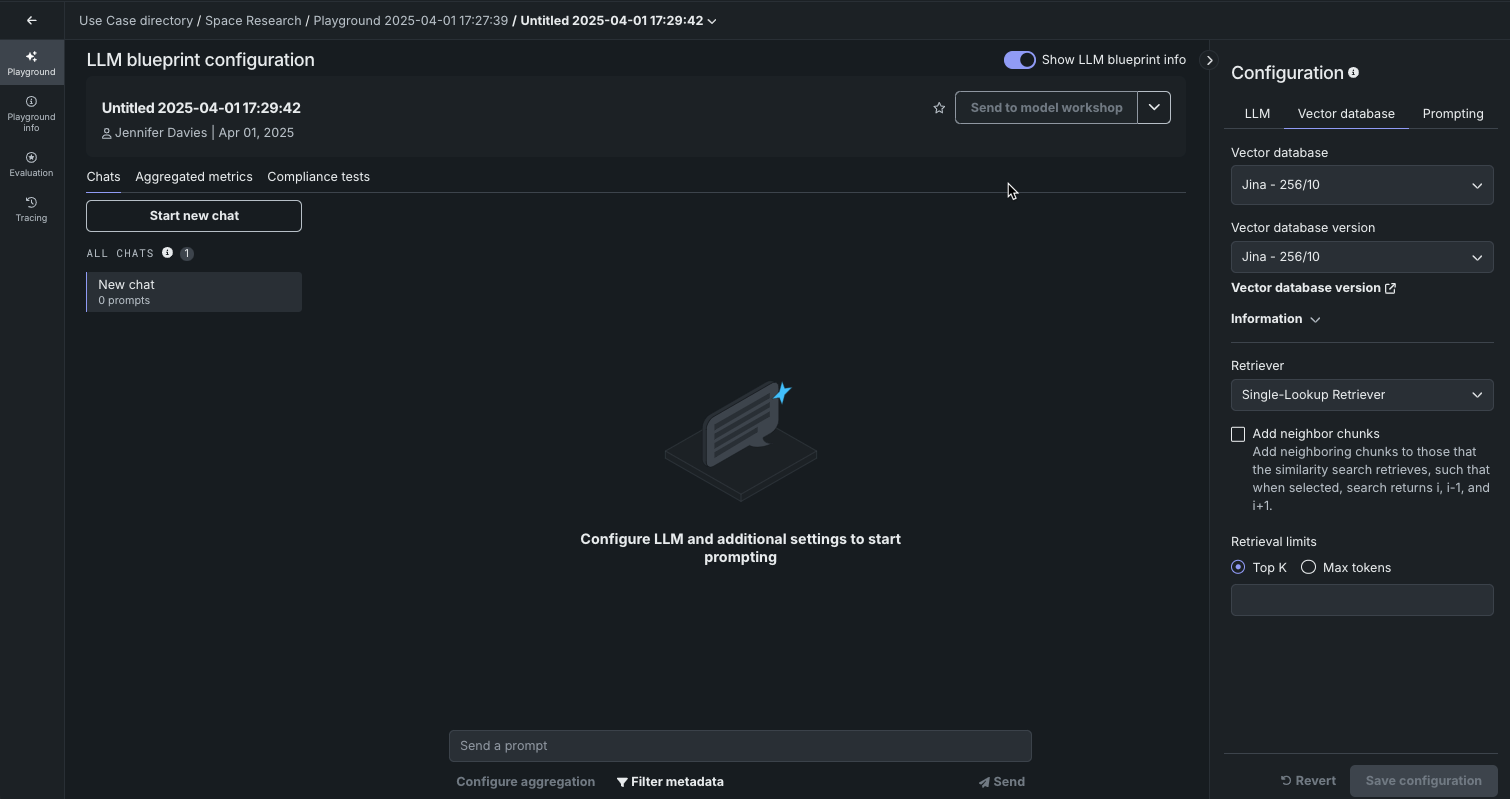 このページは、ベクターデータベースの詳細ページ内からアクセスしたものですが、全く新しいプレイグラウンドを作成しています。 LLMが選択されていないので、LLMタブでLLMブループリントを設定し、プロンプティング戦略も検討してください。