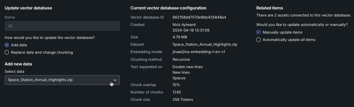 関連アイテムのヘルプテキストは、新バージョンを作成するソースベクターデータベースに関連するアセットの数を示します(「このベクターデータベースには3つのアセットが接続されています」)。ラジオボタンを使用して、新しいバージョンのソースに接続されたすべてのアセットの更新方法を手動または自動で設定します。