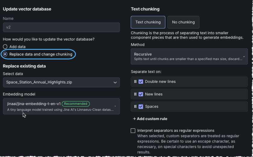 データの置換とチャンキングの変更を選択して、データソースを完全に置換し、オプションでベクターデータベースの設定を変更します。 置換データを選択するようにプロンプトされます。