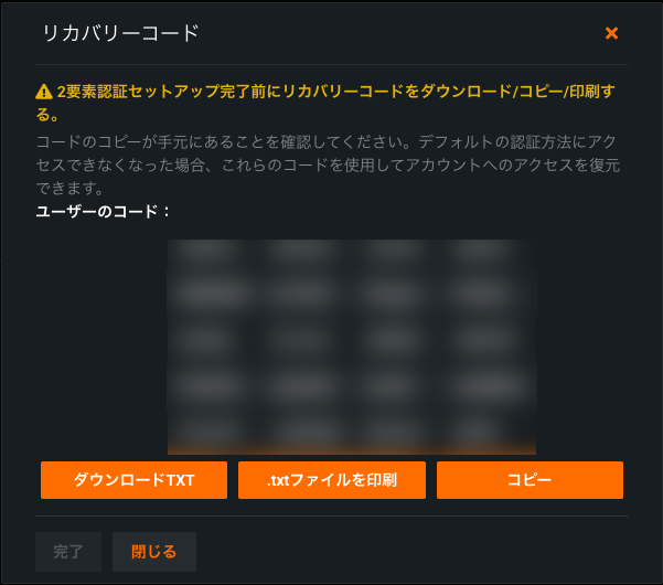 2要素認証を完了する前に、コードをダウンロード、コピー、または印刷して、安全な場所に保管しておいてください。