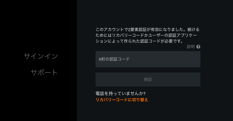 モバイルデバイスが使用できる場合は、認証アプリに表示される6桁のコードを入力します。 デバイスを使用できない場合は、リカバリーコードに切り替えをクリックして、事前に保存しておいたコードの1つを入力します。