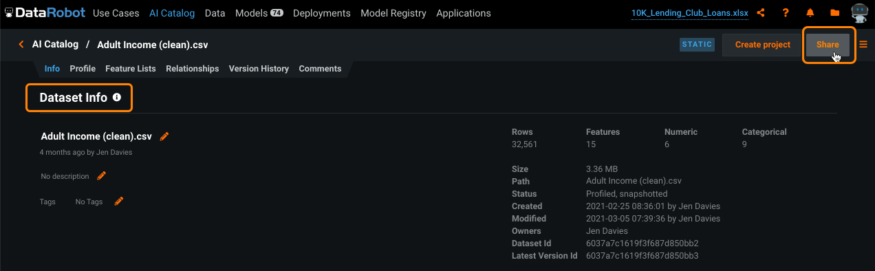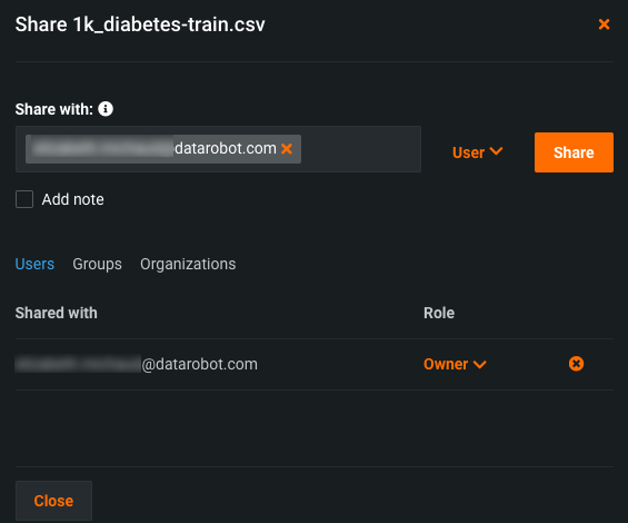 コラボレーションを強化するために、DataRobotの他のユーザーやグループ、組織のメンバーとアセットを共有できます。 ただし、共有する場合は、ユーザーとグループが同じ組織に属している必要があることに注意してください。 詳細については、テナントの分離とコラボを参照してください。