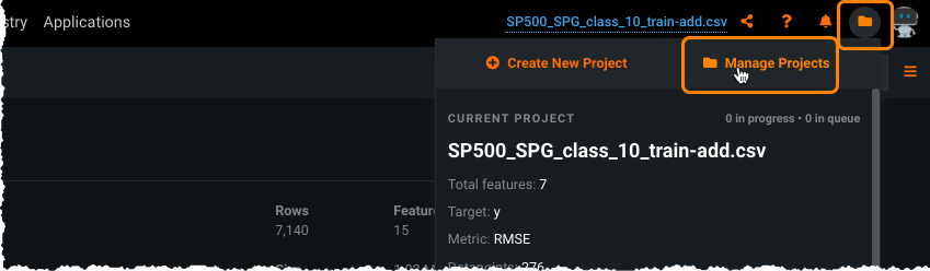 選択されたプロジェクトフィールドには、プロジェクトリストでチェックしたプロジェクトが事前に入力されています。 プロジェクトを追加するには、名前の入力を開始すると、DataRobotがエントリと文字列を一致させます。 クリックして追加します。