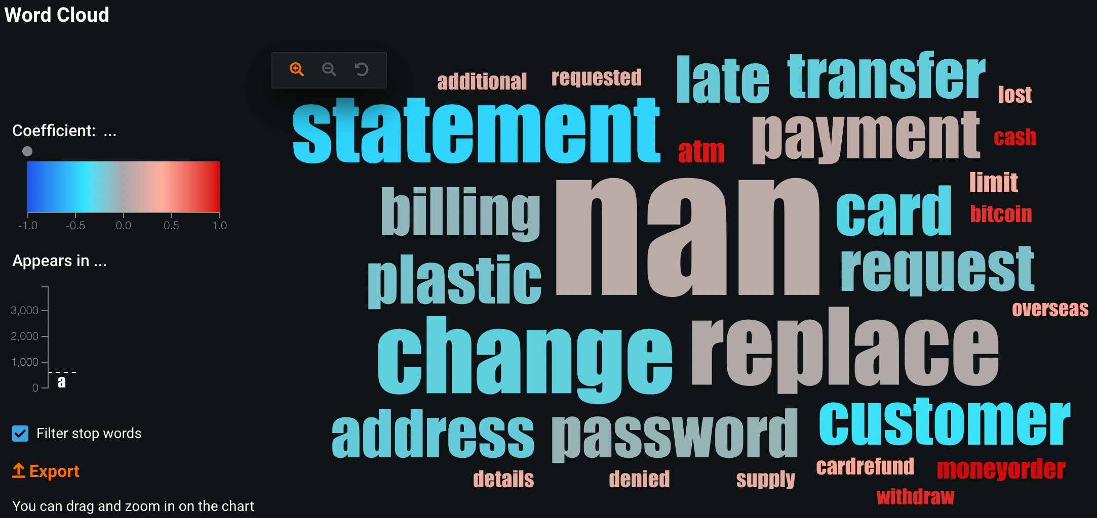ワードクラウドを使用すると、テキストフィールドが予測にどの程度影響するかを調べることができます。 ワードクラウドは、カラースペクトルを使用して、予測に対する単語の影響力を示します。 この例では、赤色の単語はアラートがSARに強く関連付けられていことを示しています。