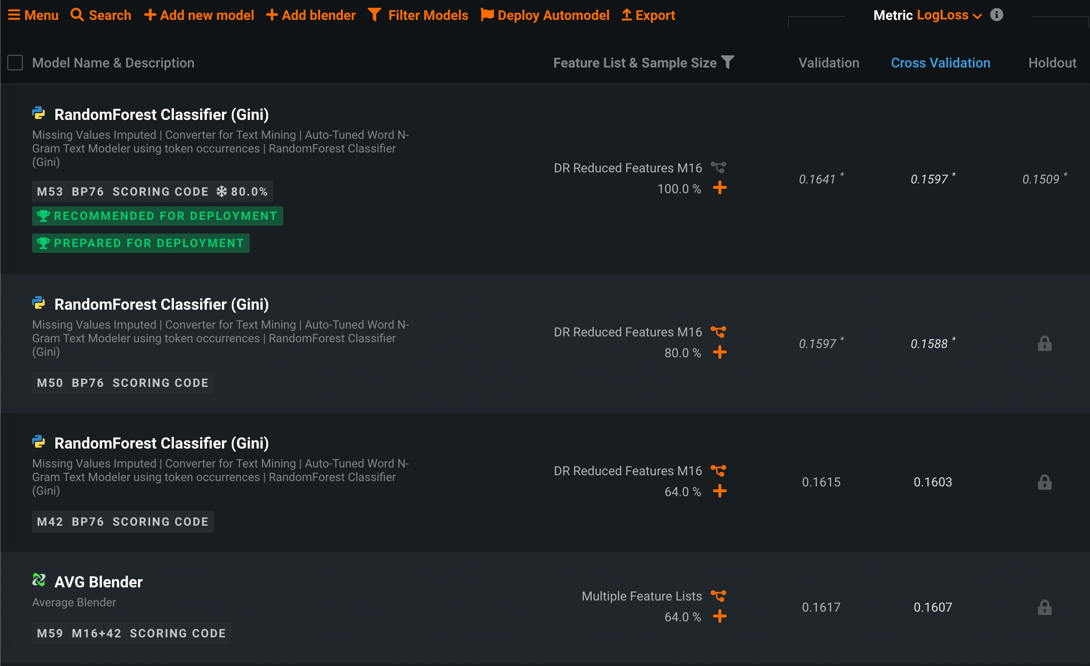オートパイロットは、指定されたターゲット特徴量に最適な予測モデルが選択されるまで、モデルの構築を続けます。 このモデルはリーダーボードの一番上にあり、デプロイの推奨バッジ付いています。