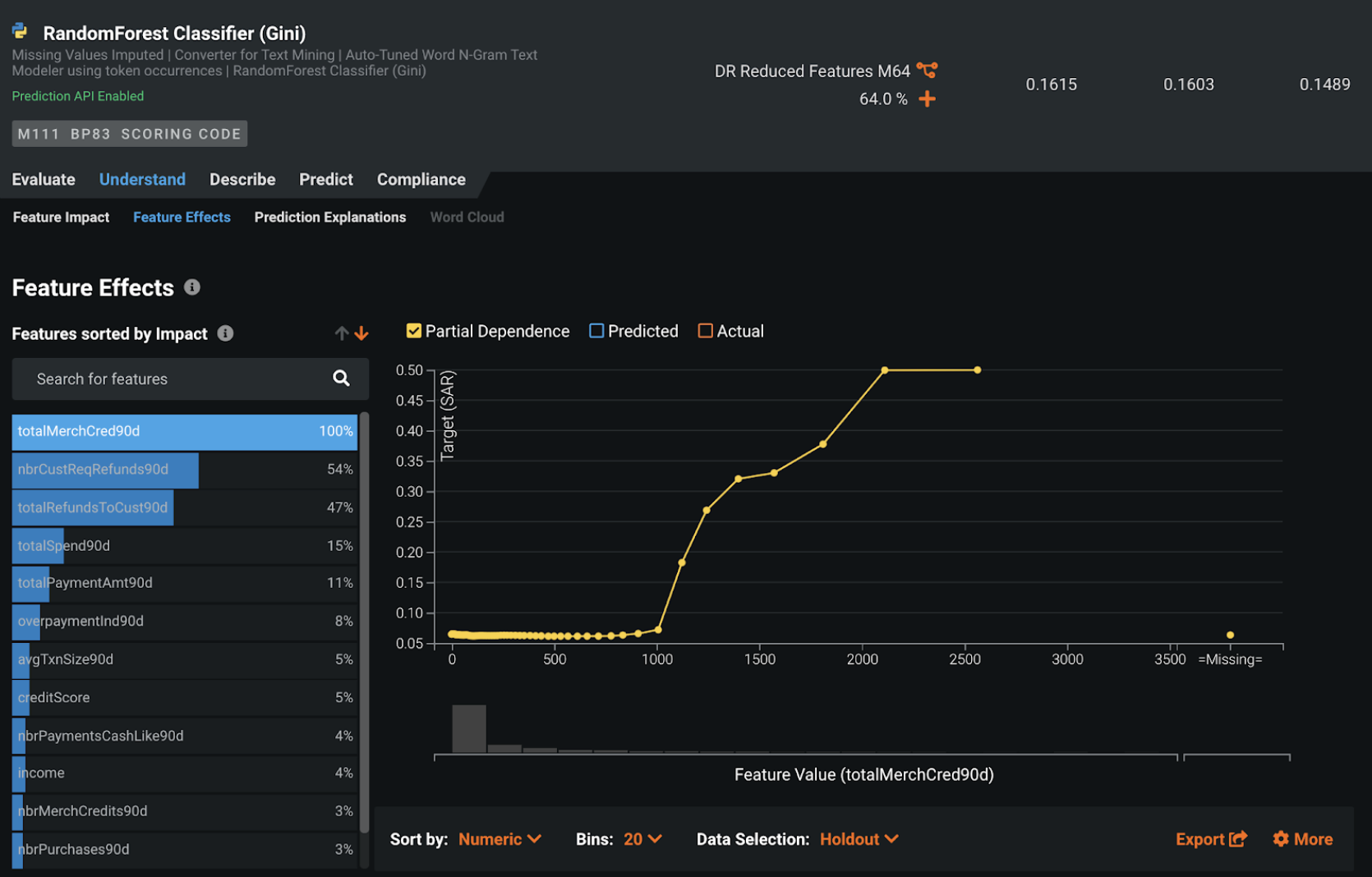 特徴量のインパクトでは、各特徴量とターゲットの関連が表示されます。 DataRobotは、最もインパクトの大きい3つの特徴量(機械がSARアラートと非SARアラートを区別できるようにする)を特定します。この例では、total merchant credit in the last 90 days、number refund requests by the customer in the last 90 days、total refund amount in the last 90 daysです。
