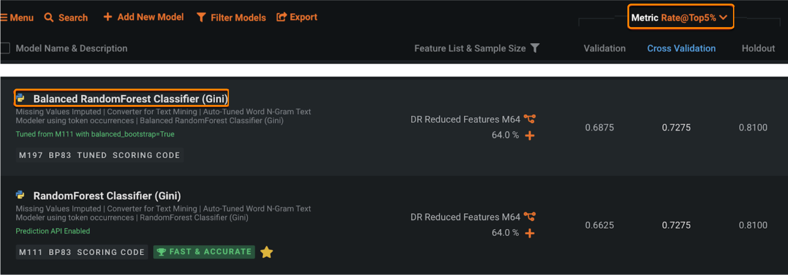 また、DataRobotでは、ハイパーパラメーターのチューニングも柔軟に行うことができ、クラス不均衡の問題解決にも役立つ可能性があります。 以下の例では、balance_boostrap(ランダムフォレスト内の各決定木でSARアラートと非SARアラートが同数のランダムサンプル)を有効にすることによって、ランダムフォレスト分類器モデルがチューニングされます。そのため、新しい「Balanced Random Forest Classifier」モデルの検定スコアが、親モデルよりわずかに優れていることがわかります。