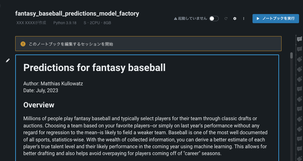 ユースケースを読み、コードセルを実行していきます。 コードを実行するには、セルの横にある再生ボタンを選択します。