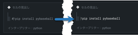 pybaseballライブラリをインストールするには、セルを編集してpip installコマンドのコメントを解除してから、セルを実行します。