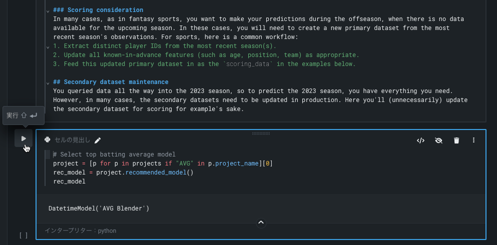 データを準備したら、アクセラレーターはDataRobotのエクスペリメントを作成し、構築されたデータセットに対して多くのモデルをトレーニングします。 このアクセラレーターは特徴量探索を利用します。これは、DataRobotの自動特徴量エンジニアリングツールで、前のステップにセカンダリーデータセットを使うことで、野球選手の最近の成績について、時間を認識するローリング特徴量を派生させます。 セルに従ってモデリングプロセスを開始します。