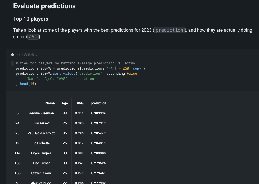 予測が返さたら、上位10選手の予想打率を評価できます。