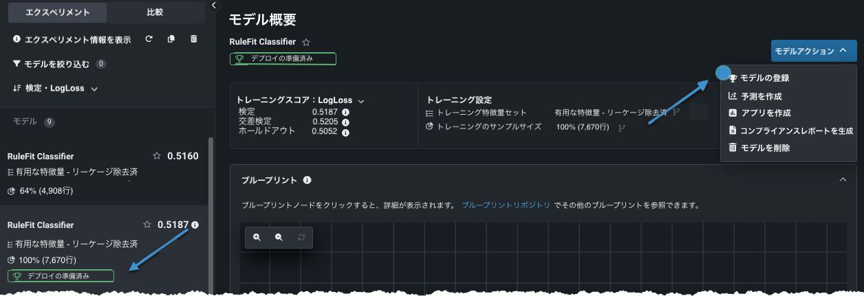 モデルを登録することで、AIランドスケープ全体で信頼できる唯一の情報源を作成できます。 たとえば、モデルのバージョニングを使用して、問題のタイプ別に整理されたモデル管理エクスペリエンスを作成できます。 モデルを登録するには、リーダーボード上でモデルを選択し、モデルのアクション > モデルの登録を選択します。 (デプロイの準備済みのモデルは、基本ステップに適しています。)