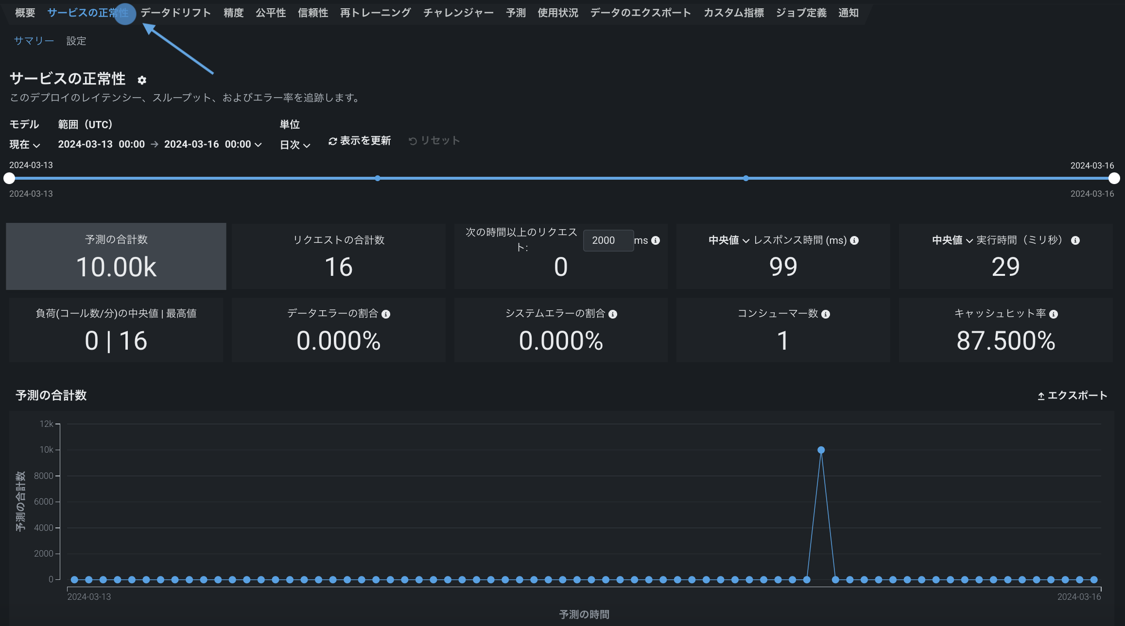 総予測数、総リクエスト数、レスポンス時間などのサービス正常性指標を確認して、モデルの運用状態を評価します。 その後、データドリフトをクリックしてモデルのパフォーマンスをチェックします。