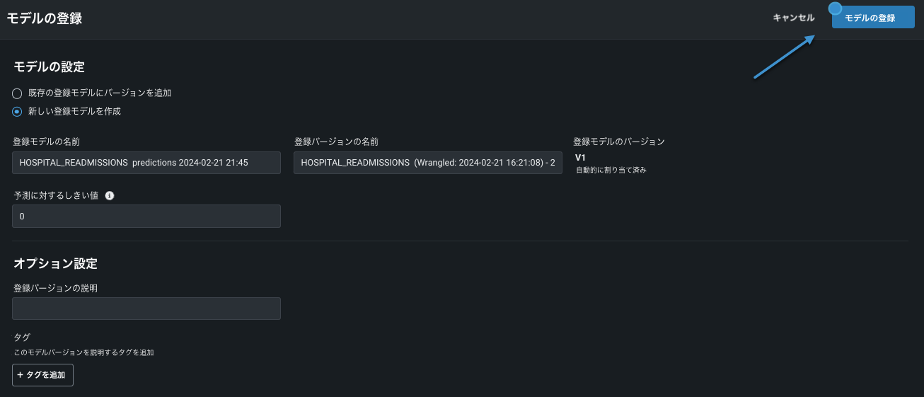 モデルを登録する際に、新しいモデルとして登録するのか、既存の登録済みモデルにバージョンを追加するのかを指定できます。 この基本ステップでは、新しいモデルとして登録し、必要に応じて説明を追加して、モデルの登録をクリックします。