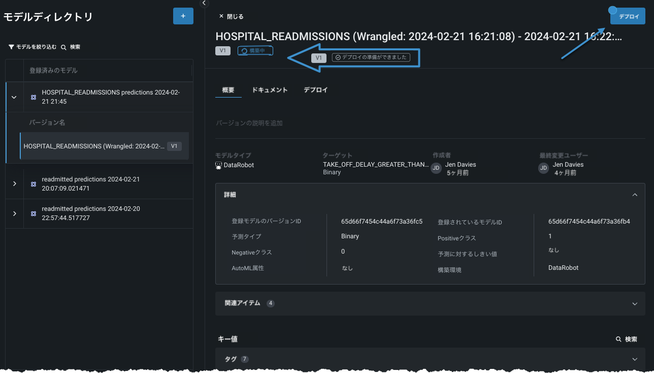 登録処理が行われているとき、DataRobotに表示された系統とメタデータを調べることができます。 この情報はトレーサビリティのために重要です。 デプロイをクリックして先に進みます。
