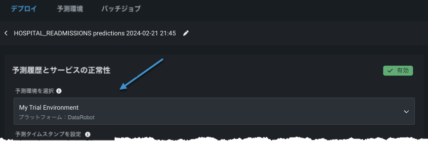 予測環境では、予測が行われている場所に基づいてアクセシビリティを制御できるため、デプロイのガバナンスが実現します。 この画面から環境を設定します(このトライアル用に環境が作成されています)。