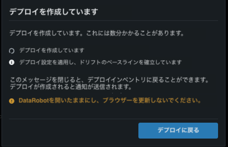 設定が適用されるとステータスメッセージが表示され、デプロイが作成されると、監視用のデータドリフトベースラインが確立されます。 このベースラインはデータドリフトダッシュボードの基準となり、デプロイ後のモデルのパフォーマンスを分析するのに役立ちます。 デプロイの準備が完了すると、自動的にコンソールの概要に進みます。