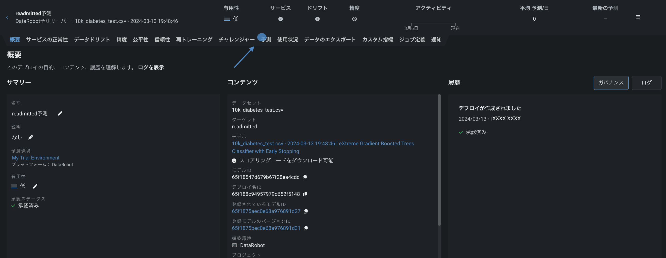 コンソールの概要には、デプロイに関する一般的な情報が数多く表示されます。 ページ上部の他のタブでは、モデルをデプロイし、デプロイされたモデルの実行、監視、最適化を行うために重要な設定を行い、レポートします。 予測タブをクリックして、1回限りのバッチ予測を行います。
