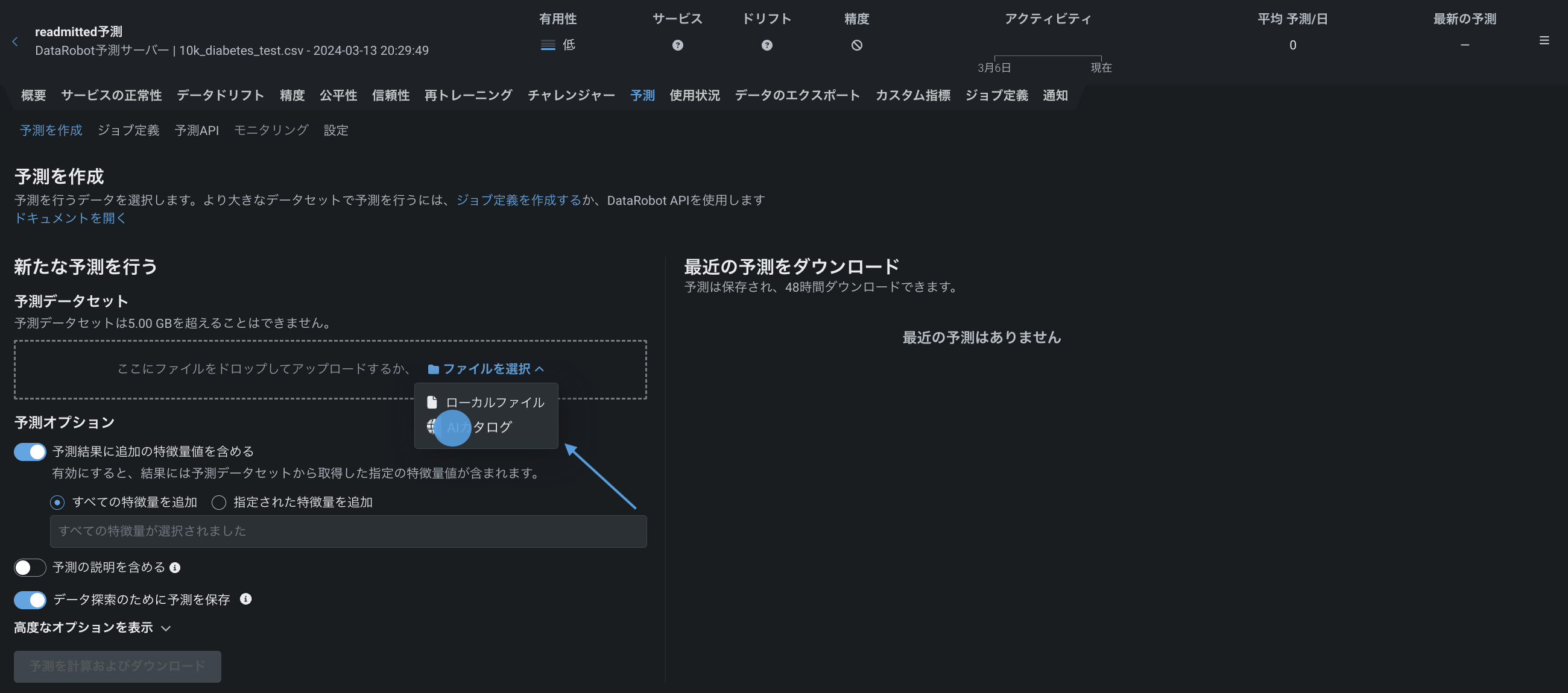 バッチ予測を行うには、予測データセットをアップロードします。 ユーザー独自のスコアリングデータをアップロードすると、自動的にデータレジストリに保存されます。 試用版では、事前に登録されたデータセットが提供されます。 ファイルを選択ドロップダウンを開き、アップロード元としてAIカタログを選択します。