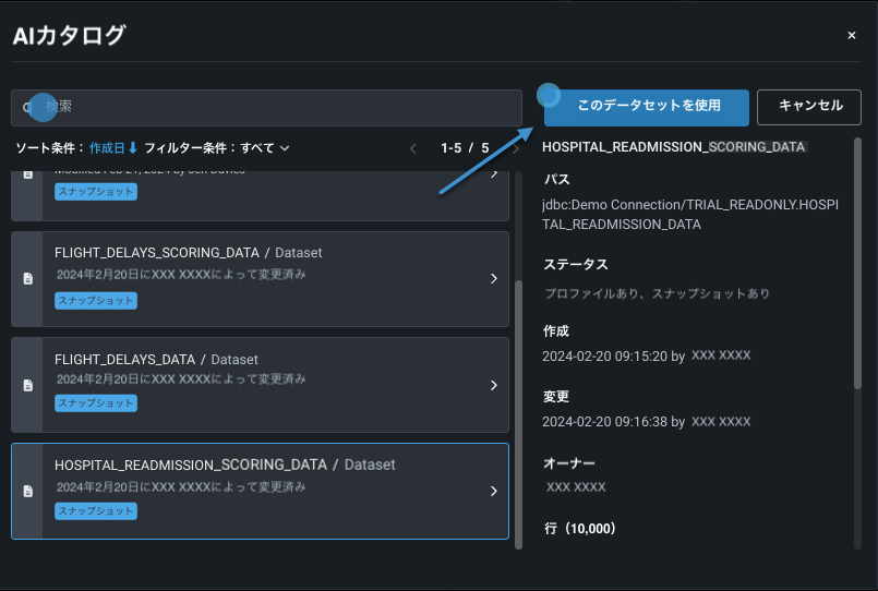 カタログから予測データセットHOSPITAL_READMISSIONS_SOCRING_DATAを見つけて選択します。 データセットをクリックして選択し、データセットのメタデータを確認します。準備ができたら、このデータセットを使用をクリックします。
