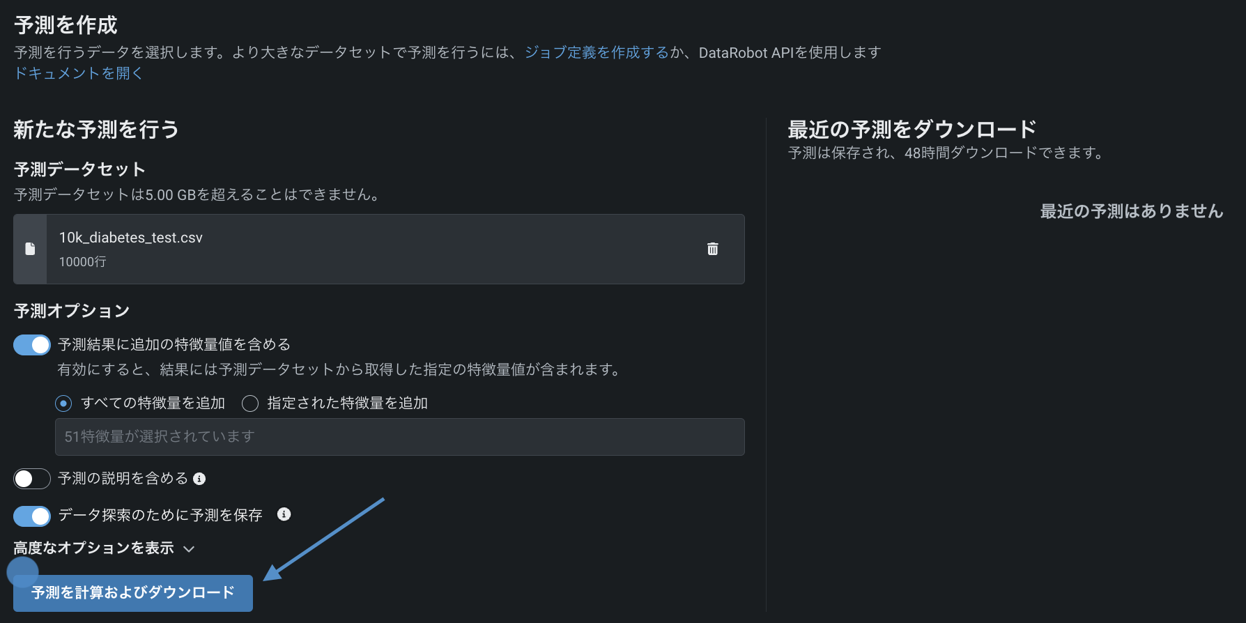 基本および高度な予測オプションにより、モデルの出力を微調整できます。 コントロールは自由に試せますが、この基本ステップではデフォルトのままにします。 画面の一番下までスクロールして、予測を計算およびダウンロードをクリックします。 計算後、直近の予測セクションにエントリーがリストされます。