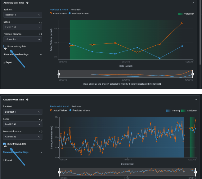 次に、時系列の精度まで下方向にスクロールします。 トレーニング期間 (濃淡のある青色) と検定期間 (濃淡のある緑色) では、予測値は青色、実測値はオレンジ色で表示されます。 コントロールを使用して、表示される系列の変更、バックテストまたは予測距離を選択します。 特定の期間を拡大するには、インサイトの下部にあるプレビューセレクターを使用します。