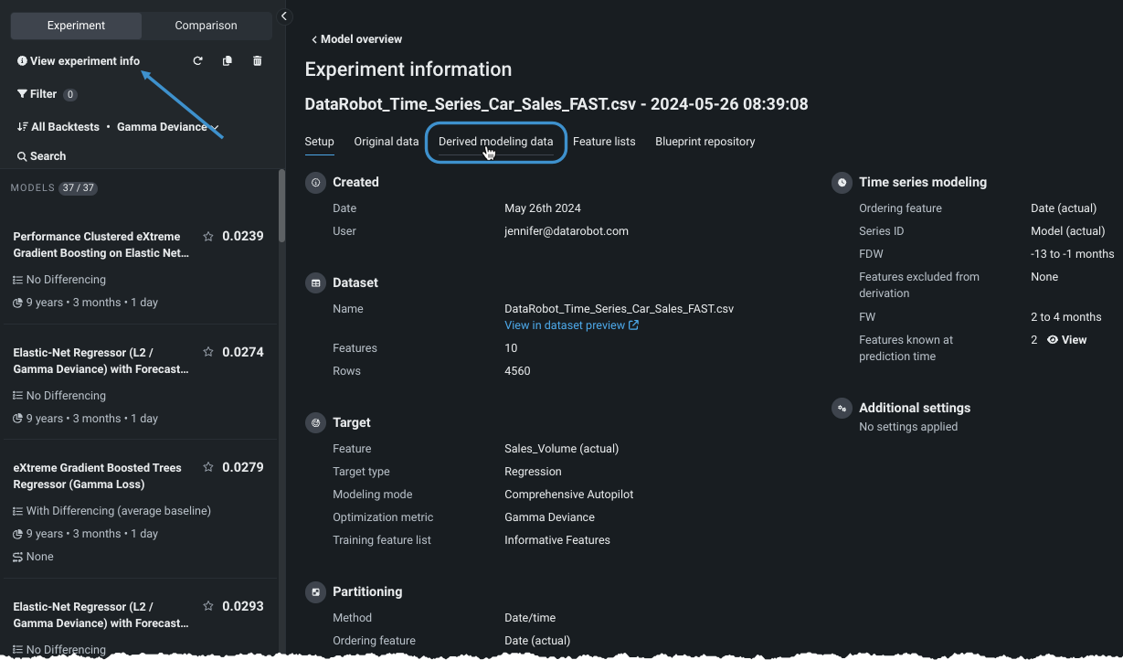 モデルトレーニング後の任意のタイミングで、エクスペリメント情報の表示をクリックして、派生データを含むサマリー情報の表示、特徴量セットの表示と作成、ブループリントリポジトリ(トレーニングする追加のブループリントにアクセスできます)へのアクセスを行います。 インサイトの計算が完了するまでの間、タブの操作を試すことができます。