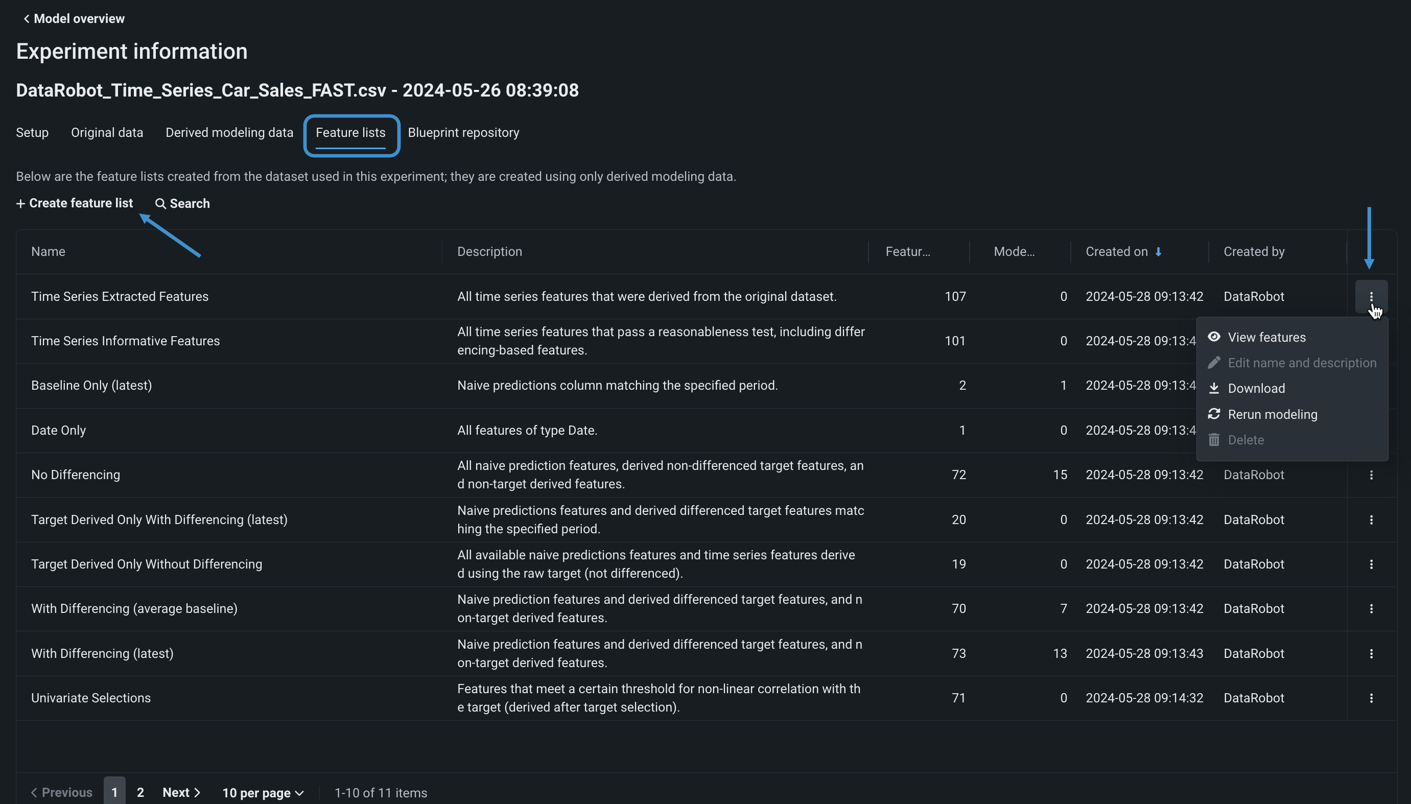 時系列予測については時系列リファレンスセクションを参照してださい。ワークベンチで時間認識モデリングのエクスペリメントを作成する方法については、NextGenのドキュメントを参照してください。
