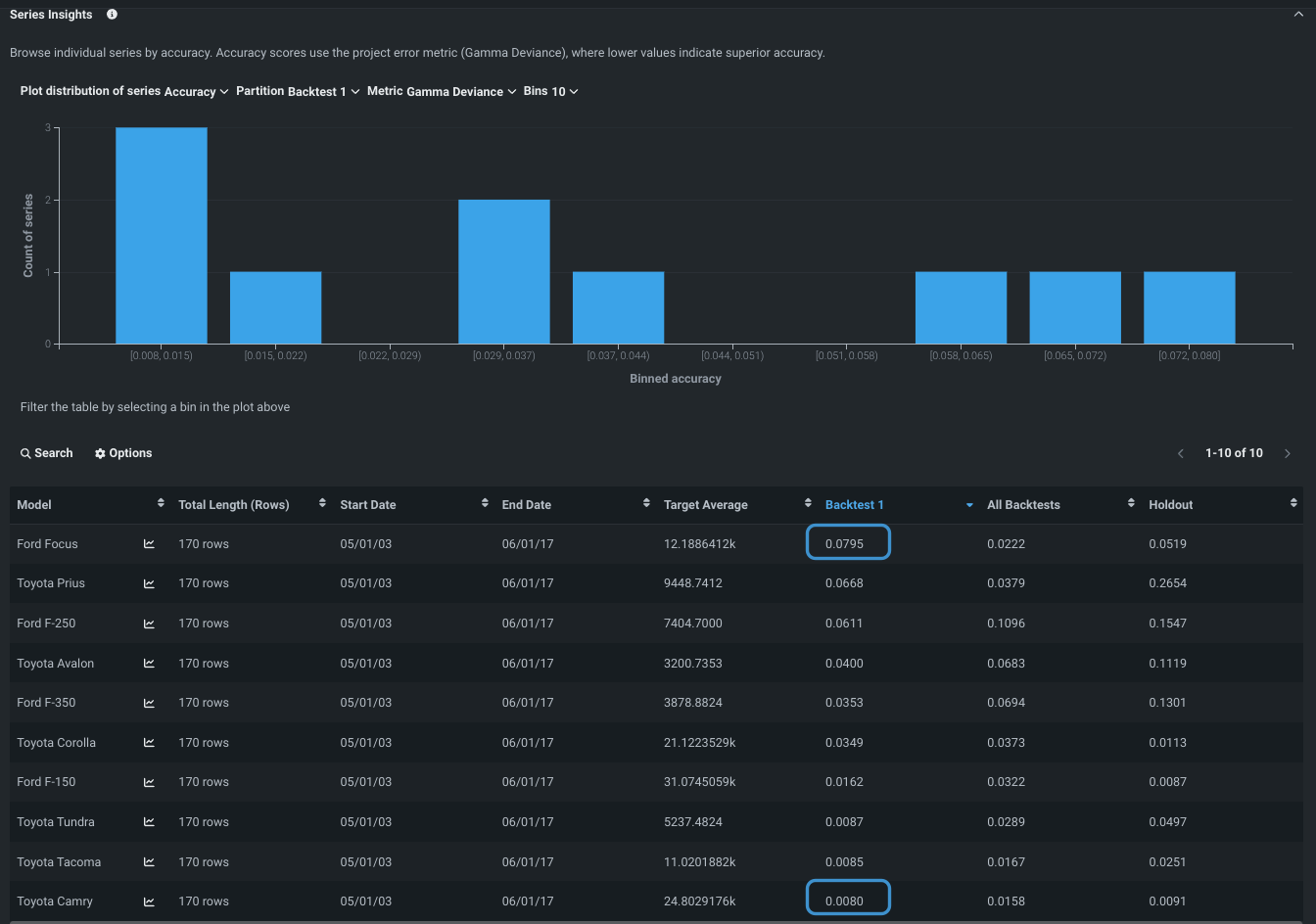 バックテスト列を確認します。ここには系列ごとの誤差が表示されます。 誤差が最も小さいのはトヨタのカムリで、最も大きいのはフォードのフォーカスであることがわかります。