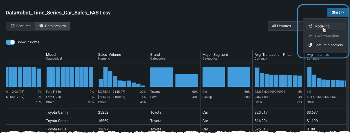 探索後、開始 > モデリングをクリックして、自動車売上データを使ったエクスペリメントを構築します。