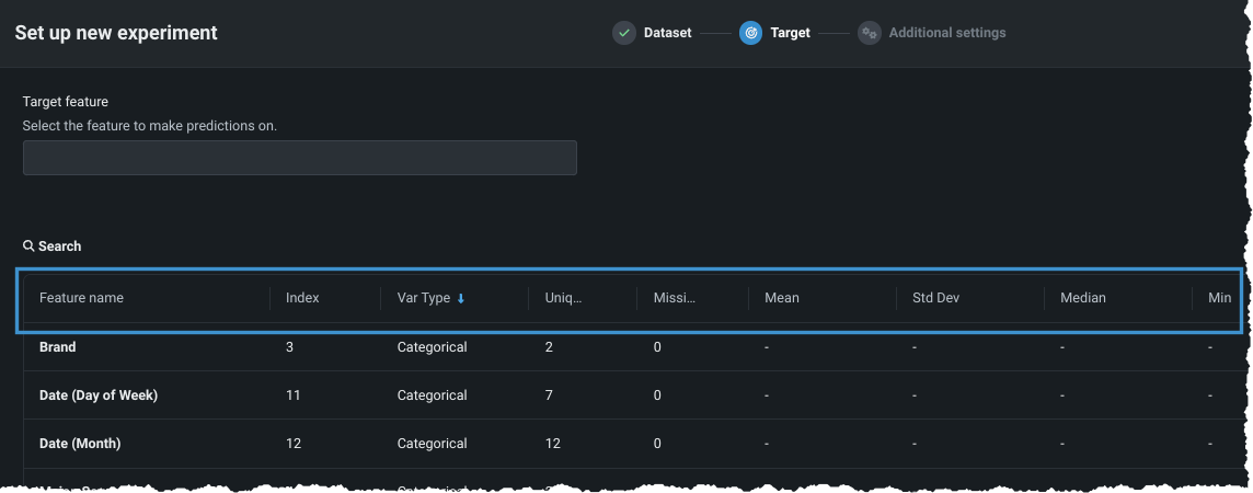 カスタムセットを作成する場合は、特徴量を個別に選択するか、一括操作を使用します。その際、必ず順序付け特徴量を含めてください。 リストの名前、および必要に応じて説明を入力します。 この基本ステップでは、自動的に作成されたセットを使用します。