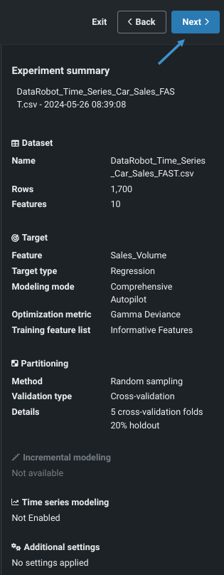 モデリングを開始するまでは、設定を変更できます。 右側のエクスペリメントサマリーでこれまでの設定を確認します。