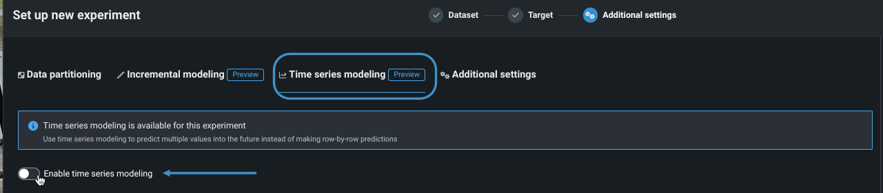時系列モデリングタブを選択し、時系列モデリングをオンに切り替えます。