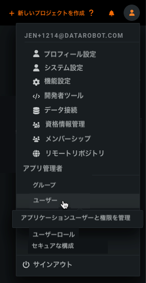 製品サポートについては、support@datarobot.comまでご連絡ください。 アプリの右上にあるクエスチョンマークのドロップダウン からすばやくアクセスして、サポートメールを送信したり、ドキュメントにアクセスしたり、YouTubeチャンネルを起動したりすることができます。