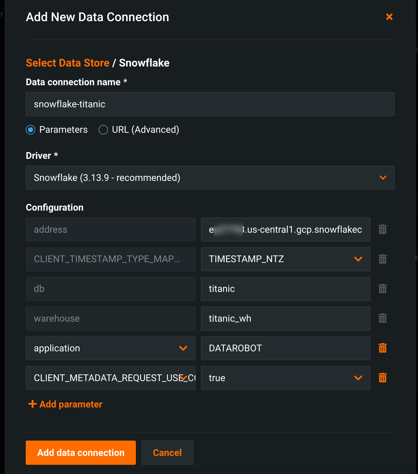 titanicです。パラメーターが指定されていない場合、Snowflakeアカウントのログインに関連付けられたデフォルト値が使用されます。