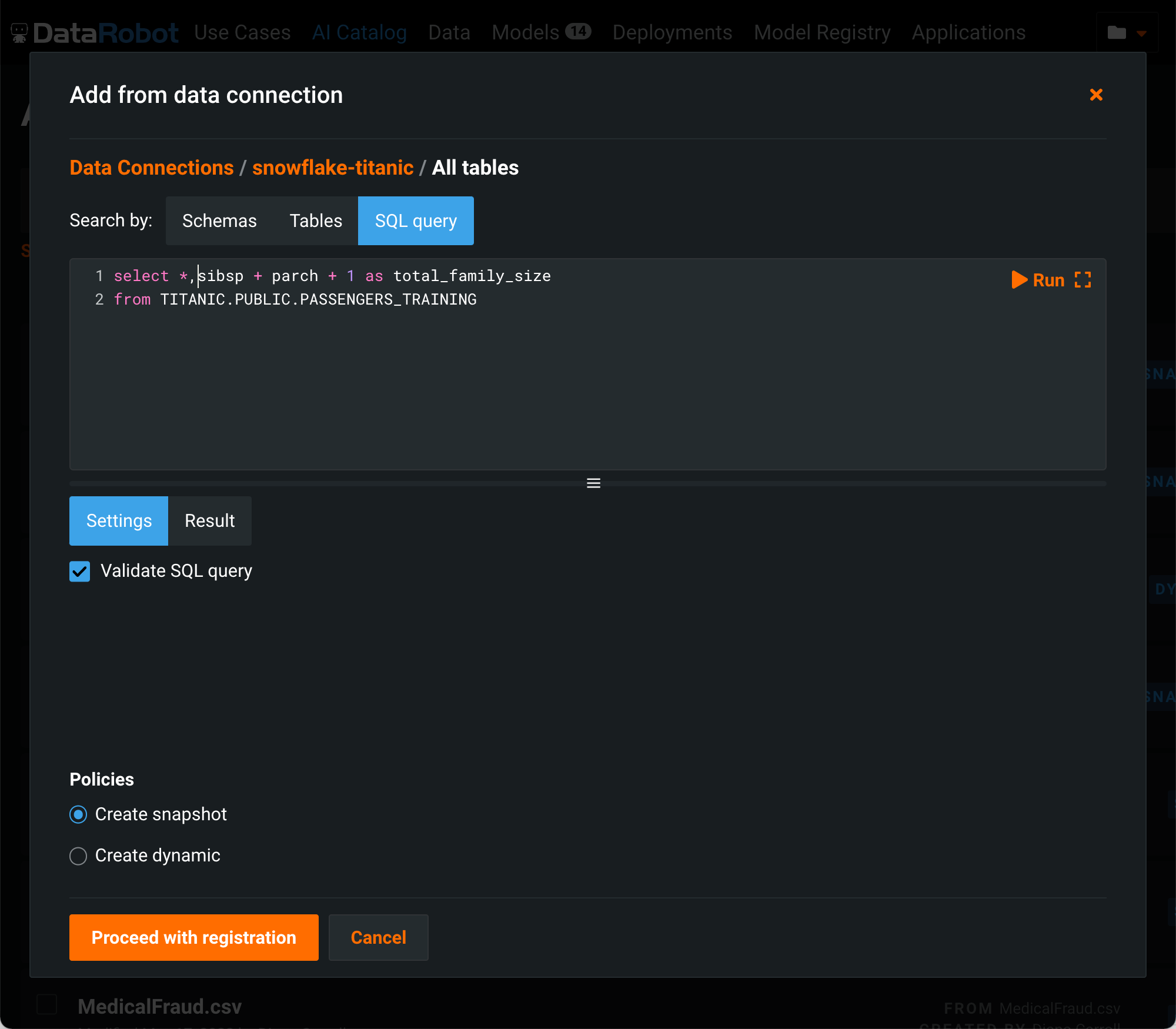 スナップショットを作成オプションに注意してください。 チェックをオンにすると、DataRobotはデータを抽出し、カタログ内のデータセットを具体化します(また、スナップショットラベルをカタログリストへ追加します)。 スナップショットはユーザー間で共有でき、プロジェクトの作成に使用できますが、データセットの新しいスナップショットを作成して具体化されたデータを最新のデータセットで更新しない限り、データベースから再度更新されることはありません。 または、動的データセットを追加することもできます。 動的な場合、後続の使用ごとにDataRobotがデータベースに対してクエリを再実行し、最新のデータを取得します。 登録が正常に完了すると、データセットがパブリッシュされ、使用できるようになります。