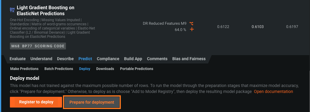 予測 > デプロイをクリックします。 リーダーボードモデルにデプロイの準備済みバッジがない場合、デプロイの準備をクリックして、そのモデルに対してモデル準備プロセスを実行することを推奨します。